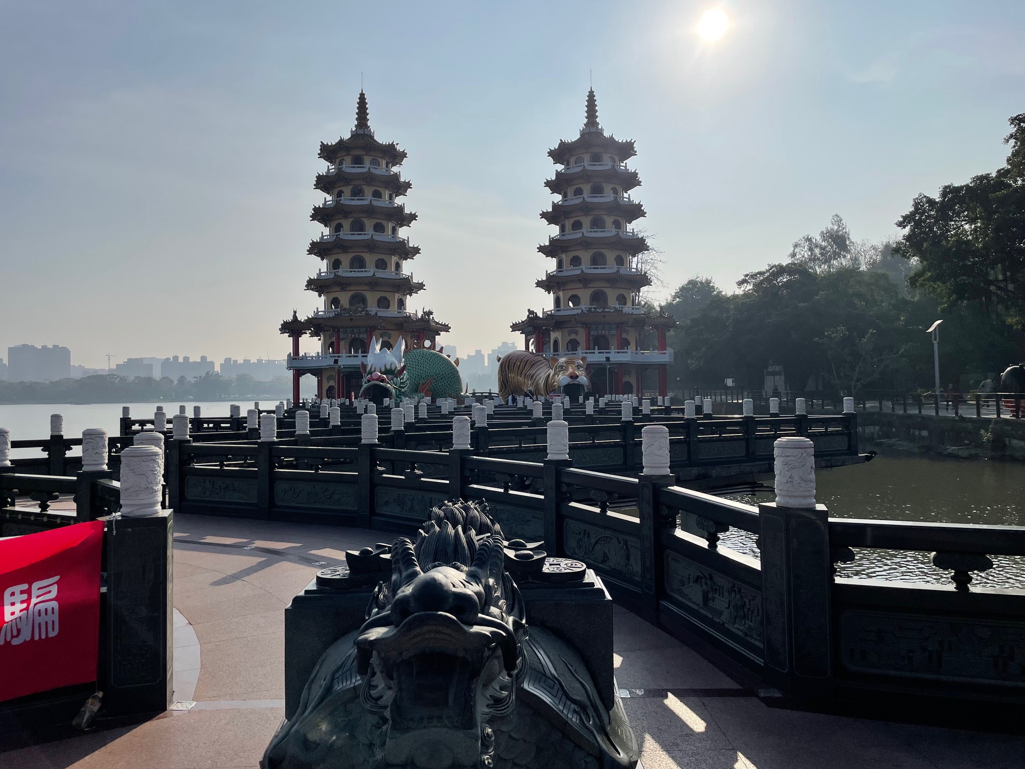 台湾高雄の龍虎塔、魔除けの意味を持つ「九曲橋」を渡り、参拝は龍の口から入り、虎の口から出るのが基本。